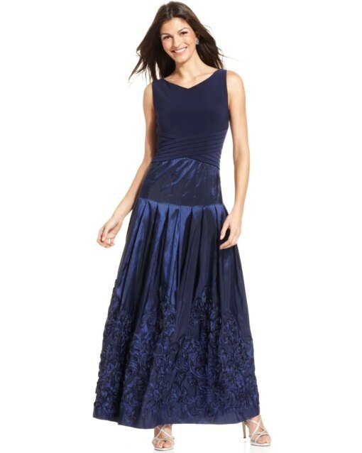 Patra’s stunning gown boasts a floral embroidered skirt that moves with you, all night long! Coordinate with silver-toned heels and baubles to let the sapphire hue stand out.