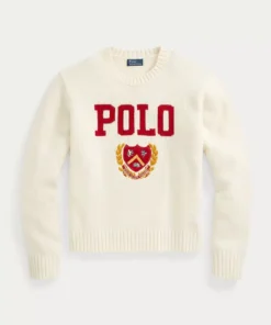- Intarsia-knit “Polo” and crest with embroidered details at the center front.