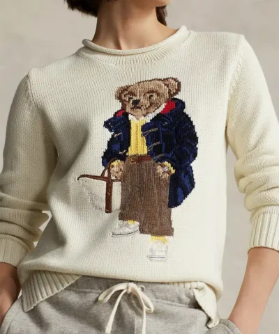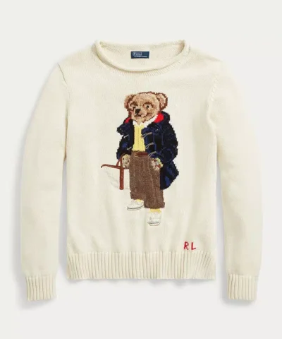 - Polo Bear intarsia-knit at the front with beading and embroidery. “RL” cross-stitched at the left hem.