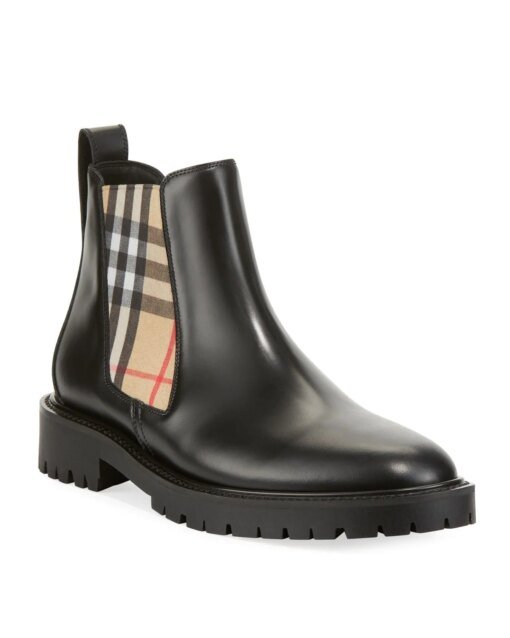 - Burberry calf grain leather Chelsea booties with signature check side gore.