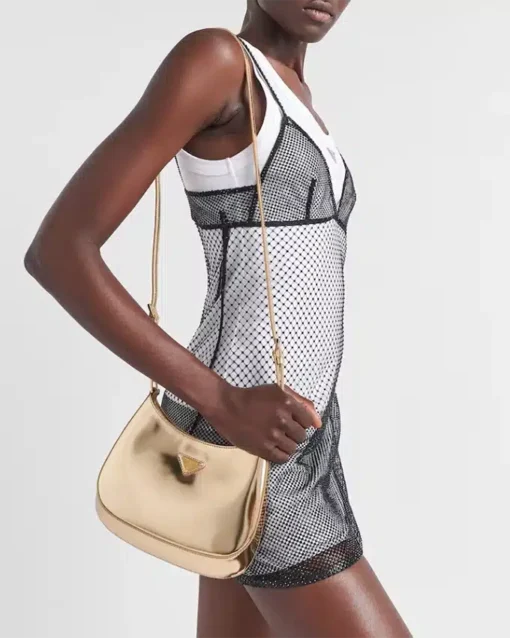 The Prada Cleo bag with sophisticated allure reinterprets an iconic design of the brand from the ’90s. The sleek, curved lines emphasized by the particular sloping construction on the bottom and sides give this hobo bag a soft, light look. Brushed leather, a distinctive material of Prada collections, is modern and versatile, perfect for always new combinations and contrasts. The enamel triangle logo completes the silhouette.