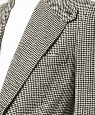 Preston elbow-patch detail blazer from Ralph Lauren Collection featuring houndstooth pattern, elbow patches, classic lapels, front button fastening, long sleeves, two front flap pockets, black/white, wool and lambskin.