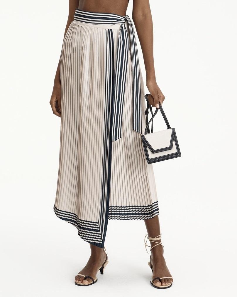 – High-waisted pleated skirt with navy stripe printing