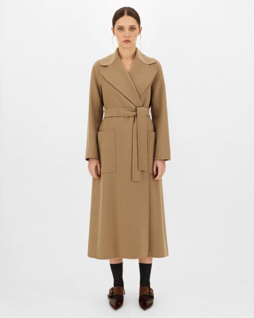 Slightly flared long coat in hand-sewn double-faced pure wool fabric. The model boasts a lapel collar and patch pockets. Matching belt fastening.