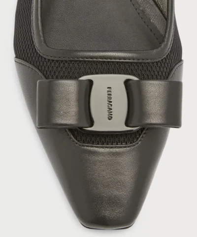 • Ferragamo “Anz” ballerina flats in knit fabric and calf leather with signature logo engraved bow accent