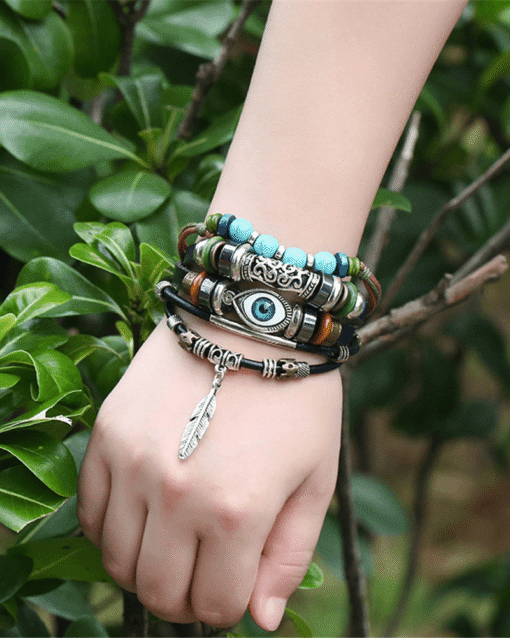Steffe Bohemian Multilayers Turkish Eye Leather Bracelets For Women and Men Adjustable Vintage Stone Wristband Bracelet.