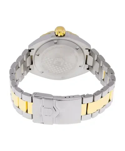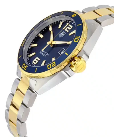 Stainless steel case with a two-tone (silver-tone and yellow gold-plated) stainless steel bracelet. Uni-directional rotating yellow gold-plated bezel with a blue top ring. Navy blue dial with luminous yellow gold-tone hands and index hour markers. Arabic numerals mark the 6 and 12 o’clock positions. Minute markers around the outer rim. Dial Type: Analog. Luminescent hands and markers. Date display at the 3 o’clock position. Quartz movement. Scratch resistant sapphire crystal. Screw down crown. Solid case back. Round case shape. Case size: 41 mm. Case thickness: 11 mm. Band width: 20 mm. Band length: 8 inches. Deployment clasp. Water resistant at 200 meters / 660 feet. Functions: date, hour, minute, second. Luxury watch style. Watch label: Swiss Made. Item Variations: WAZ1120 BB0879, WAZ1120-BB0879, WAZ1120/BB0879, WAZ1120BB0879. Tag Heuer Formula 1 Navy Blue Dial Two-tone Men’s Watch WAZ1120.BB0879.