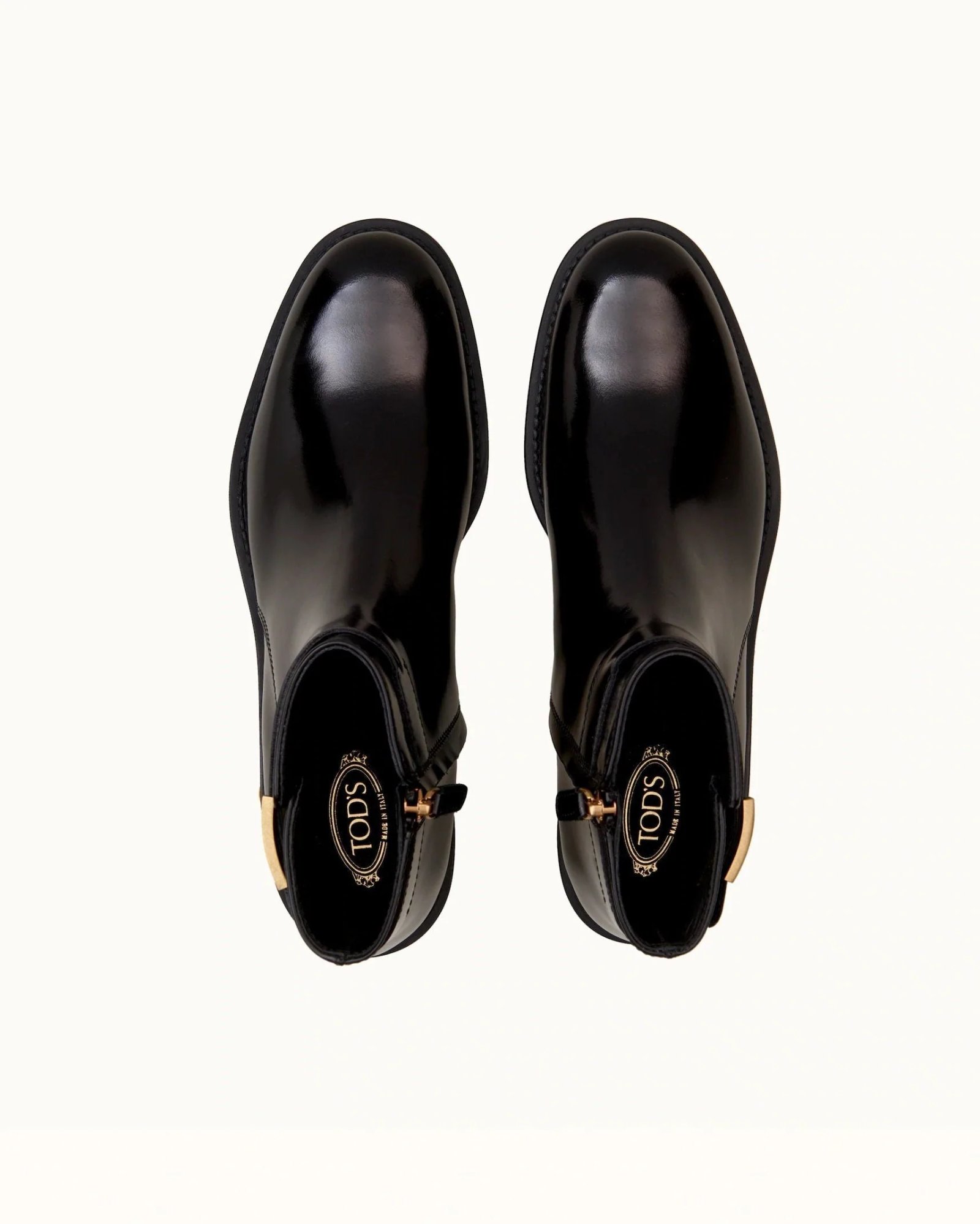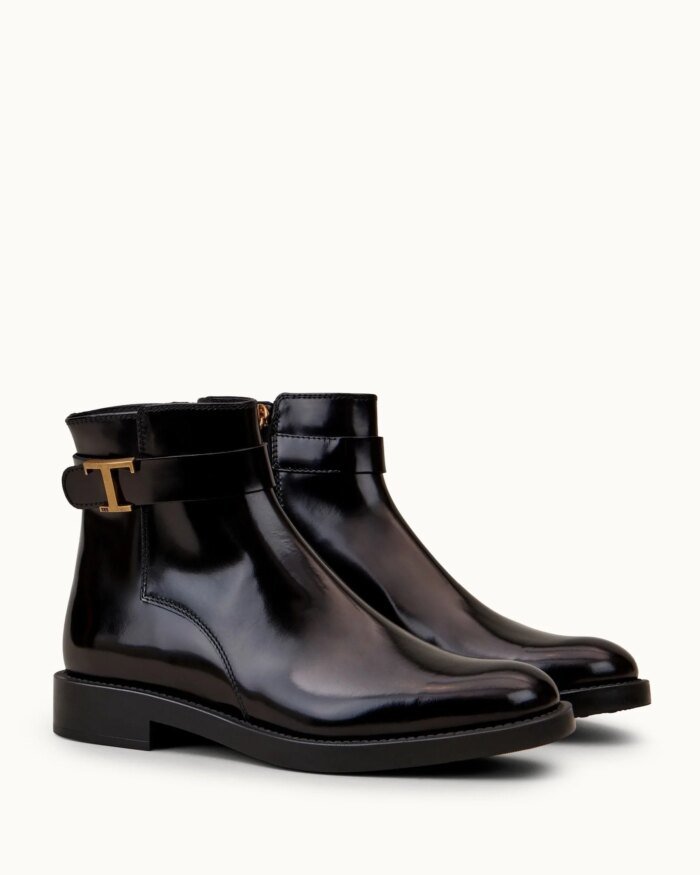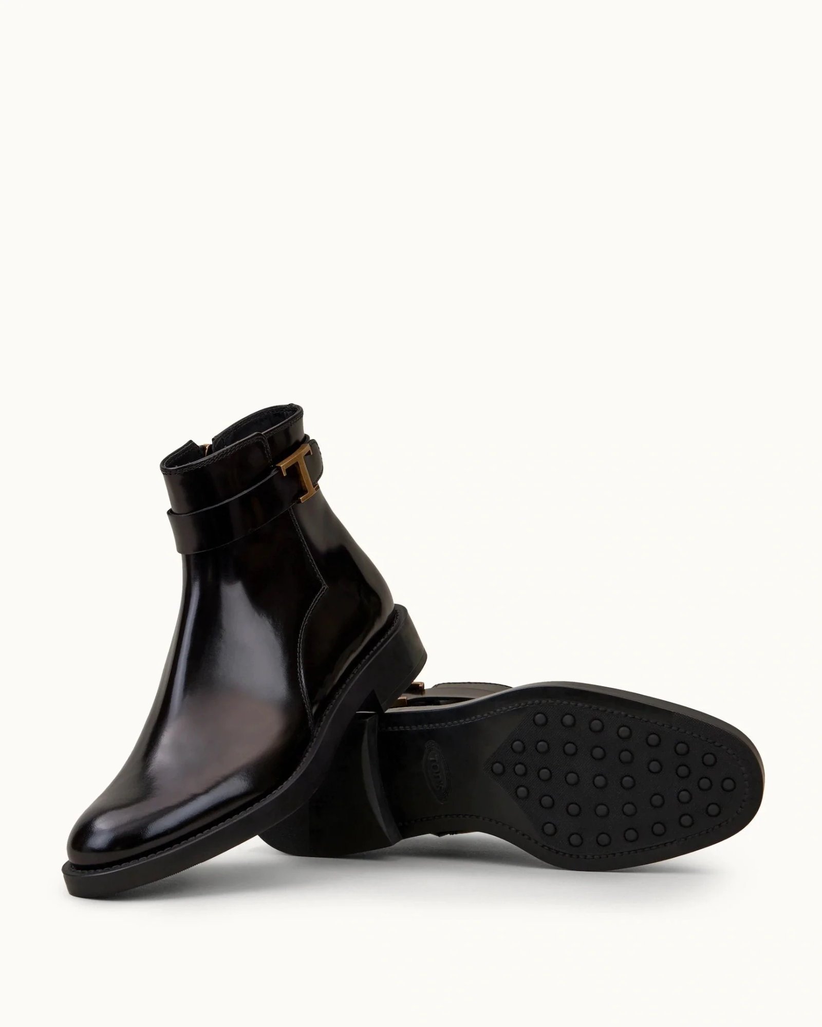 Ankle boots in elegant leather with Tod’s T Timeless accessory, side zip and rubber outsole with embossed rubber pebbles.
