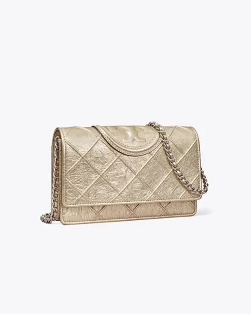 Enduring glamour. Diamond pintucks. Brushed gold chain, braided with leather. A feminine silhouette sealed with an oversized Double T. The Fleming Soft Chain Wallet is made of the softest leather, with pockets for cards, a phone and full-length bills.