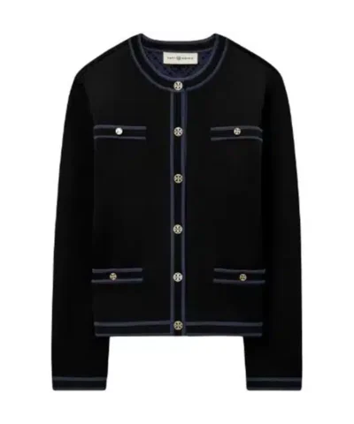 Tory Burch’s Kendra cardigan is crafted of a luxe jacquard-knit. This long-sleeve piece is styled with goldtone logo buttons, contrast trim, and welt pockets at the chest and waist.