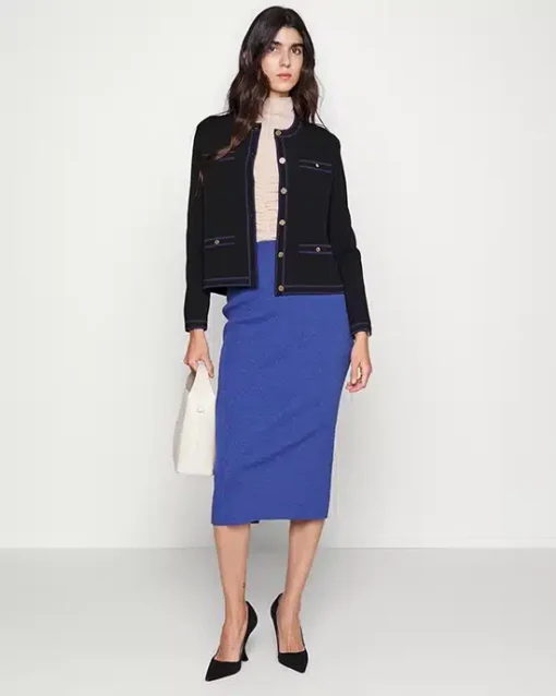Tory Burch’s Kendra cardigan is crafted of a luxe jacquard-knit. This long-sleeve piece is styled with goldtone logo buttons, contrast trim, and welt pockets at the chest and waist.