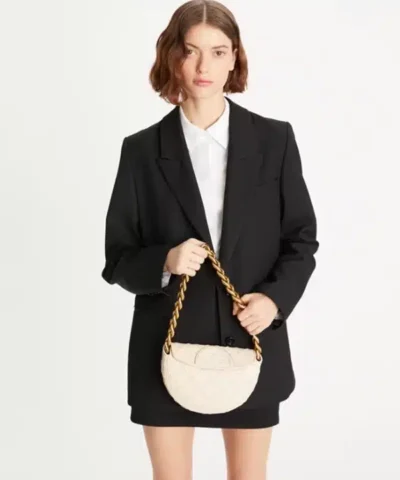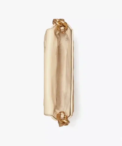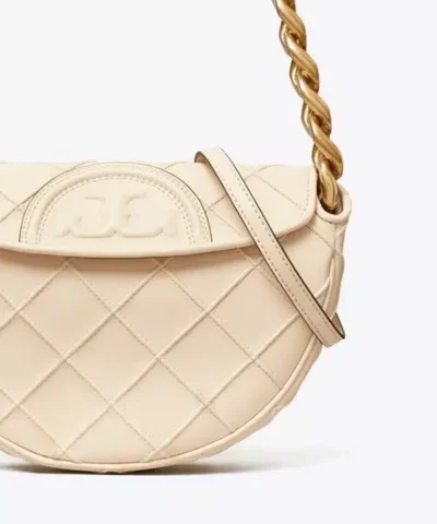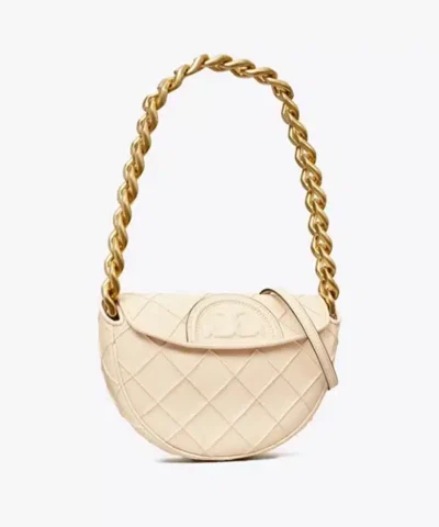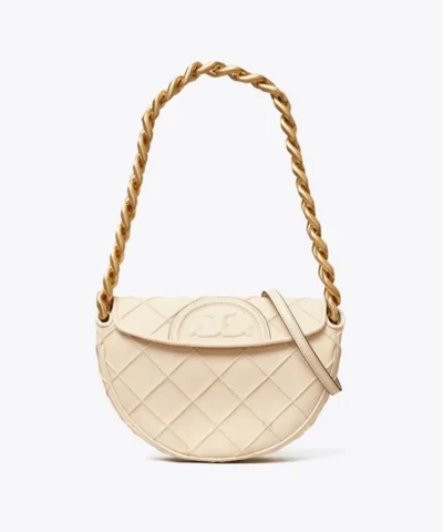 Enduring glamour. Pintucks in a diamond pattern and the softest leather. Sealed with an oversized Double T. The Mini Fleming Crescent Bag has a chunky chain strap and a secure snap closure that opens to multiple card pockets for organization. Wear it tucked under the arm or crossbody with the removable strap.