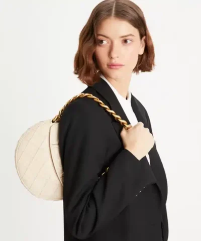 - Chunky chain shoulder strap with 9.8″ (25cm) drop; adjustable, removable leather crossbody strap with 22.1″ (56cm) drop