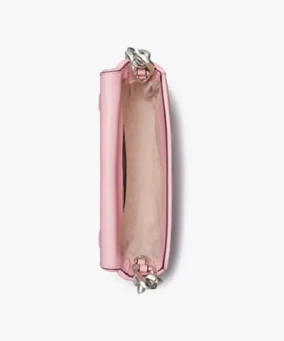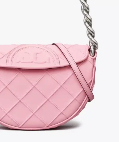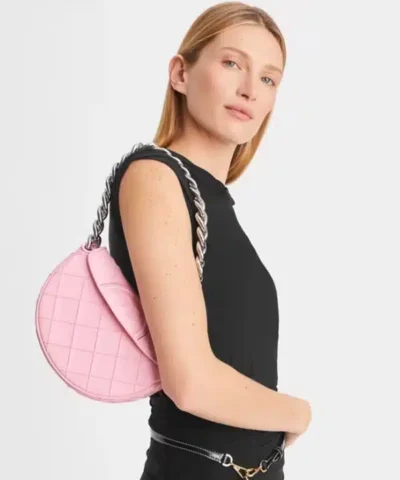 Enduring glamour. Pintucks in a diamond pattern and the softest leather. Sealed with an oversized Double T. The Mini Fleming Crescent Bag has a chunky chain strap and a secure snap closure that opens to multiple card pockets for organization. Wear it tucked under the arm or crossbody with the removable strap.