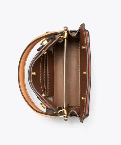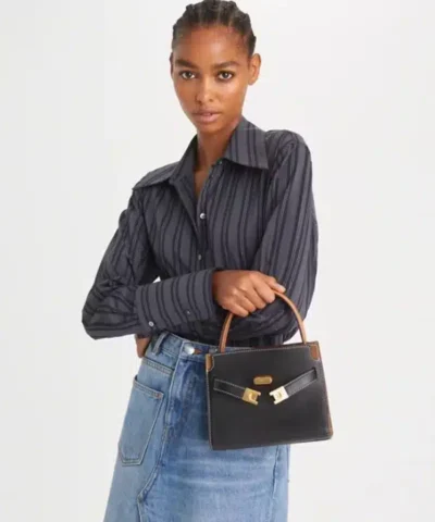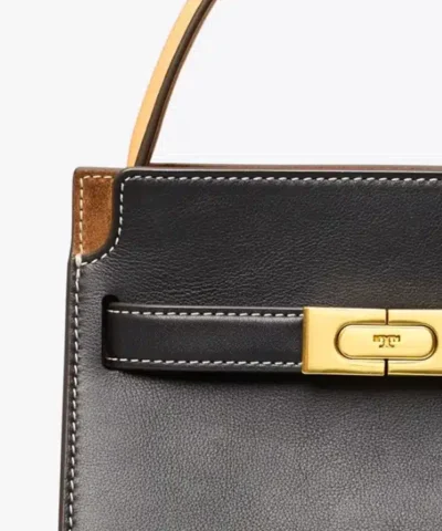 From our runway: The Petite Lee Radziwill Double Bag contrasts structure and softness, mixed materials, different colors. Composed of layers that unfold like the collar of a trench coat, it can be worn opened, semi-buttoned or fully closed. Beautifully crafted in leather and suede, with signature lock-and-key hardware and an optional crossbody strap. The collection is named for Lee Radziwill, who was fearlessly unique.