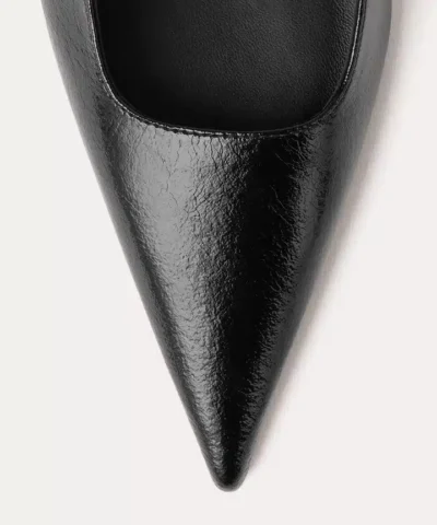 TOTEME heels made in Italy from crackled patent leather. They are shaped to a sharp silhouette with a pointed toe, slim elastic straps, soft leather lining and a sculpted heel measuring 50mm. Wear them to go from work to dinner.