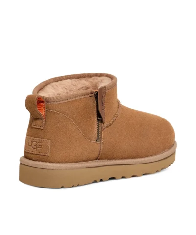 The UGG Classic Ultra Mini Zip boots are the perfect complement to any look. Made with a high-quality suede upper, these boots offer comfort and style. With a suede heel counter and a rear pull tab, these boots are easy to put on and take off. They also feature a side zip for a secure fit. These boots will make you stand out wherever you go.