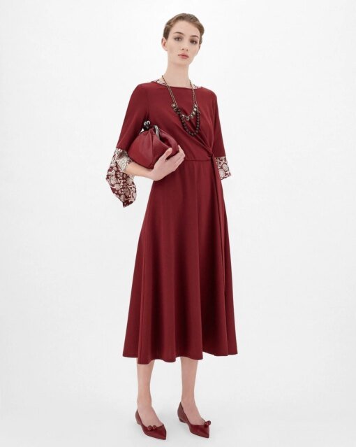 Boat-neck midi dress in heavy lyocell jersey fabric with long elbow sleeves. The garment boasts a fit-and-flare line, in addition to an asymmetrical bow at the waist and a full flared skirt.