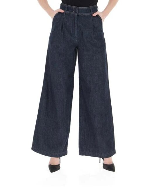 Pure cotton denim loose fit trousers featuring front darts, open pockets, belt loops, zip fly and hooks fastening.; Designer colour name: Blu Notte