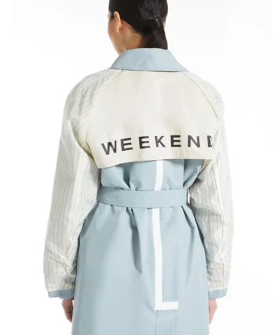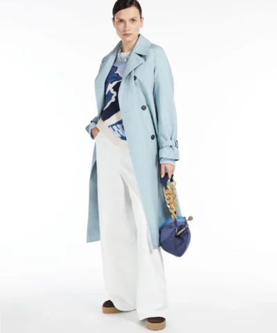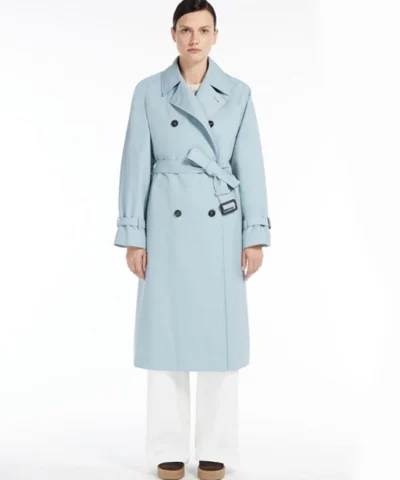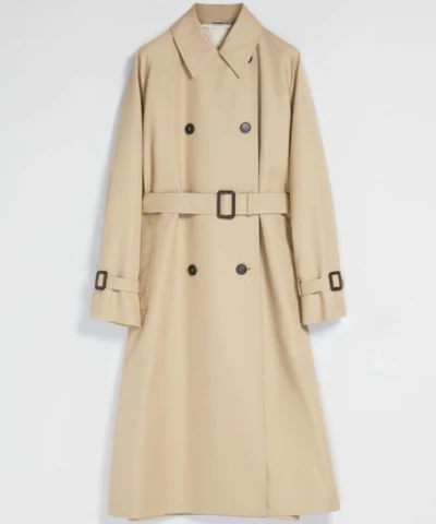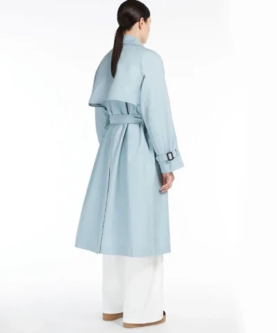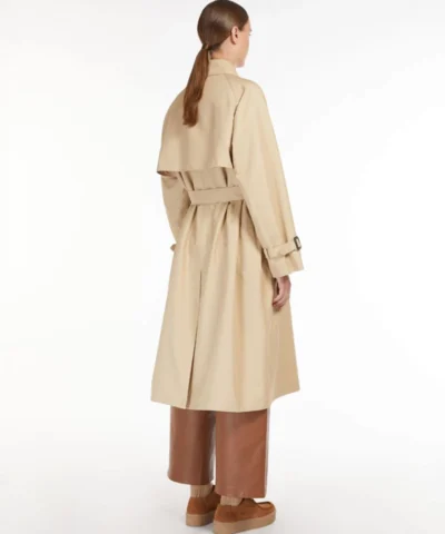 Trench coat in water-repellent cotton-blend gabardine fabric. The model boasts a lapel collar, welt pockets, adjustable cuff tabs, a fastening vent and a detached rear yoke. Double-breasted button fastening and a matching belt.
