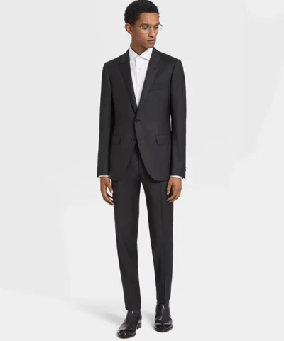 Made from superfine, ultra breathable Trofeo™ wool, the black tailoring suit flaunts a luxuriously smooth and comfortable finish. The tailored fit complements the longer, more elastic fibers, creating a dynamic vision of contemporary menswear. A staple of any business wardrobe, this versatile suit makes a lasting impression.